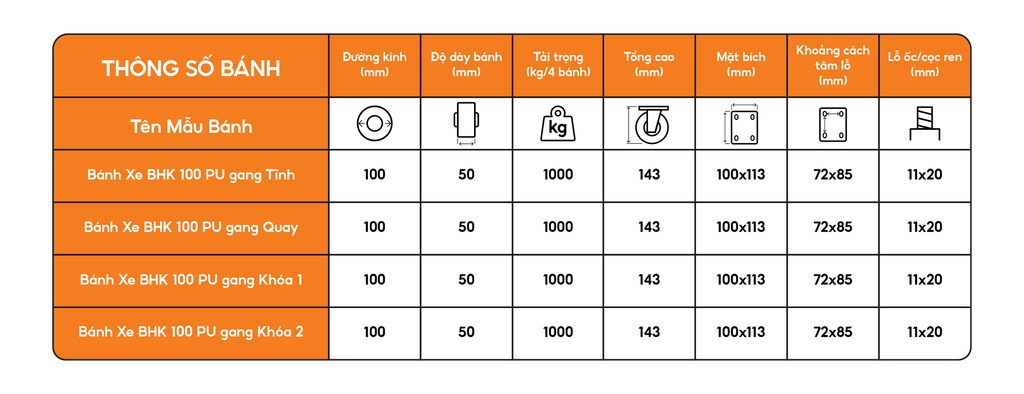 Bánh xe đẩy BHK PU gang là lựa chọn hoàn hảo cho các doanh nghiệp cần sản phẩm có khả năng chịu tải lớn, bền bỉ và vận hành êm ái trong môi trường công nghiệp. Hãy liên hệ ngay với chúng tôi để nhận thêm thông tin và tư vấn về sản phẩm bánh xe đẩy công nghiệp chất lượng cao này!