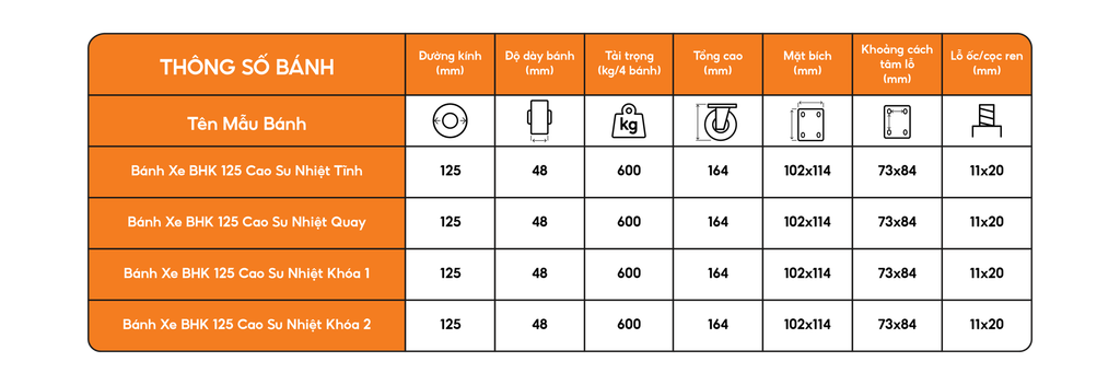 Tải trọng 550~700 kg / 1 bộ (4 bánh xe). Bánh xe đường kính 100x50 mm càng quay có khóa kép.
