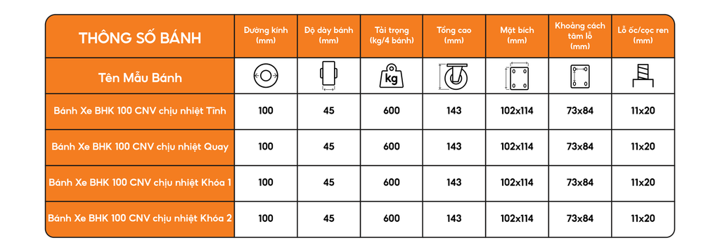 Với phần bánh xe được làm bởi chất liệu nhựa chịu nhiệt cực tốt, có thể chịu được nhiệt độ cao lên tới 280°C trong thời gian dài. Chất liệu nhựa còn giúp giảm khói lượng của bánh giúp việc di chuyển nhẹ nhàng hơn, dễ dàng di chuyển và điều khiển, đồng thời không tạo ra vết hay trày xước. Phần càng bánh được làm từ chất liệu gang cứng cáp, để bộ bánh BHK CNV có thể chịu được tải trọng lớn cũng như nhiệt độ cao, chinh phục môi trường làm việc khắc nghiệt.